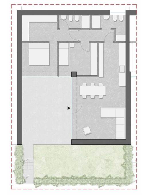 Trilocale al piano terra con ingresso indipendente dal proprio giardino di 25 m² e patio coperto di 26 m²: varcata la soglia si entra in un luminoso living-cucina open-space con vetrate scorrevoli a tutta altezza; le due camere si affacciano anch’esse sul patio e sono servite da due bagni con doccia. Nel prezzo è compreso la cantina.