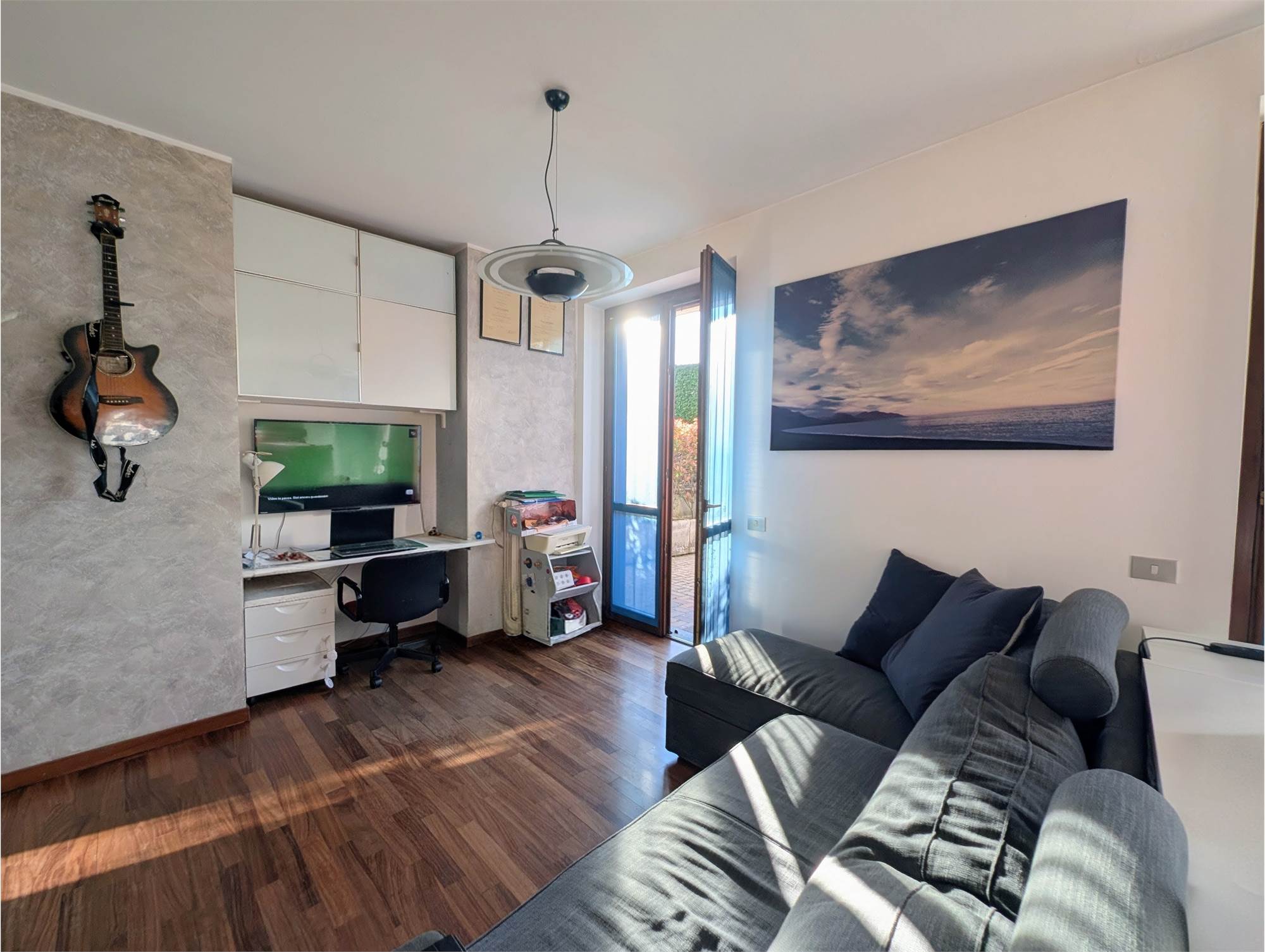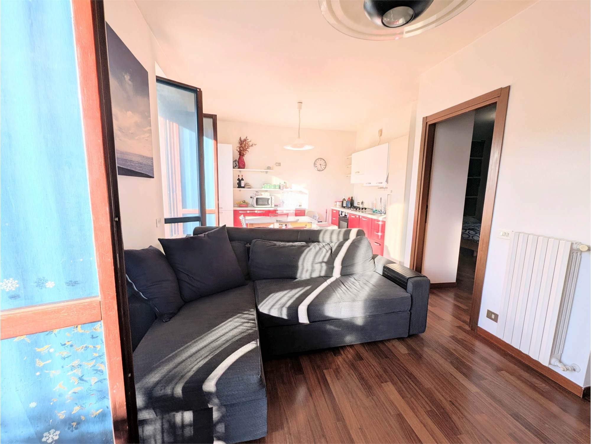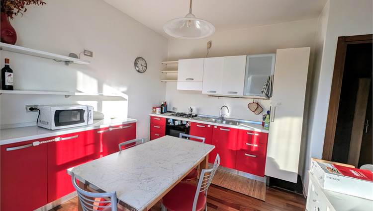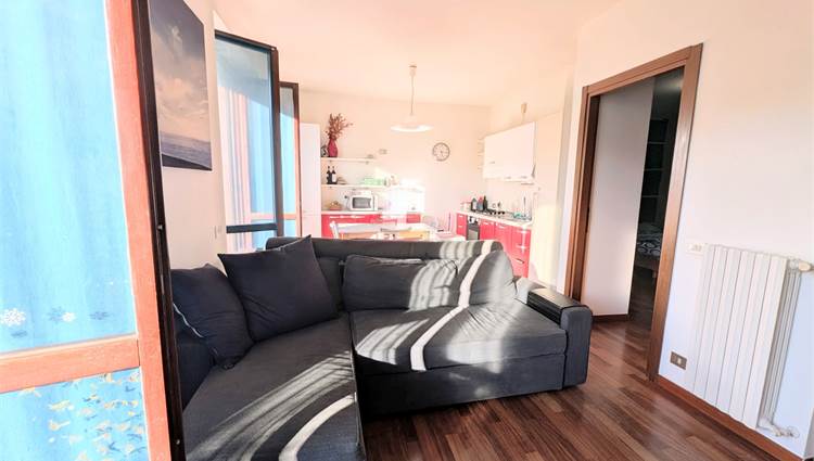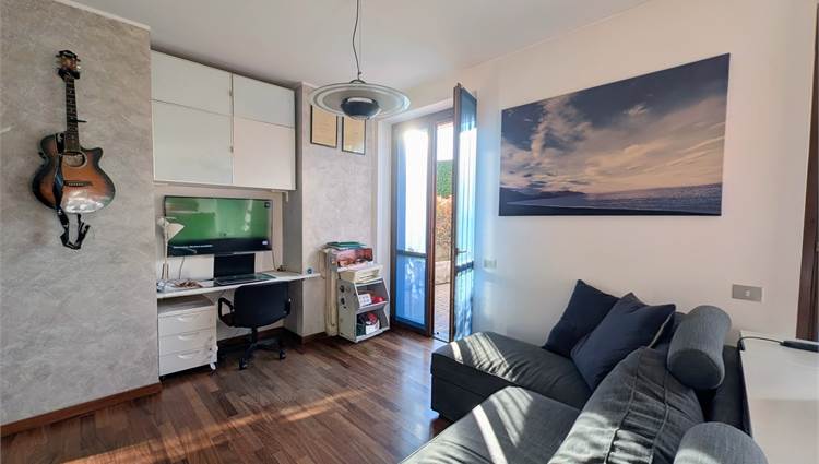 L'ingresso introduce a una zona living open space, dove il calore del parquet si fonde armoniosamente con una cucina a vista. La camera matrimoniale molto ampia e con uscita su un ulteriore terrazino.