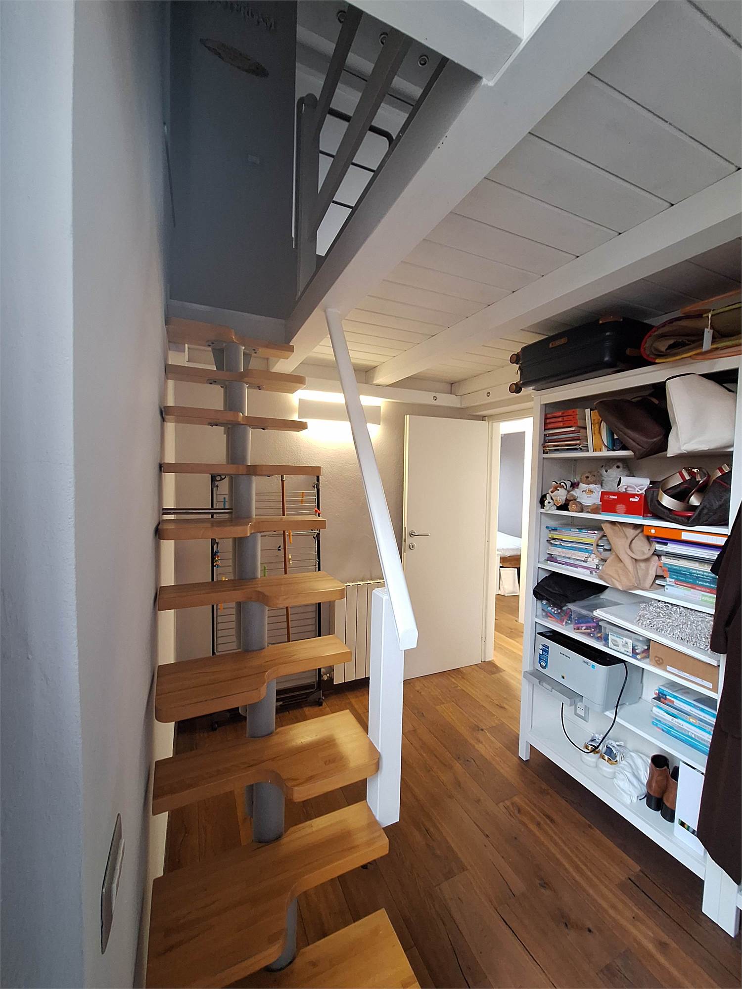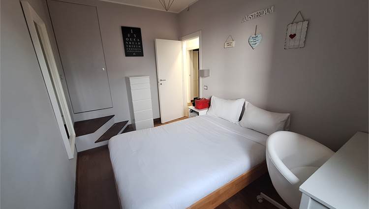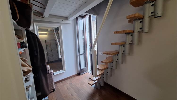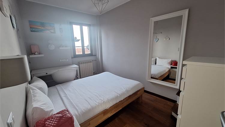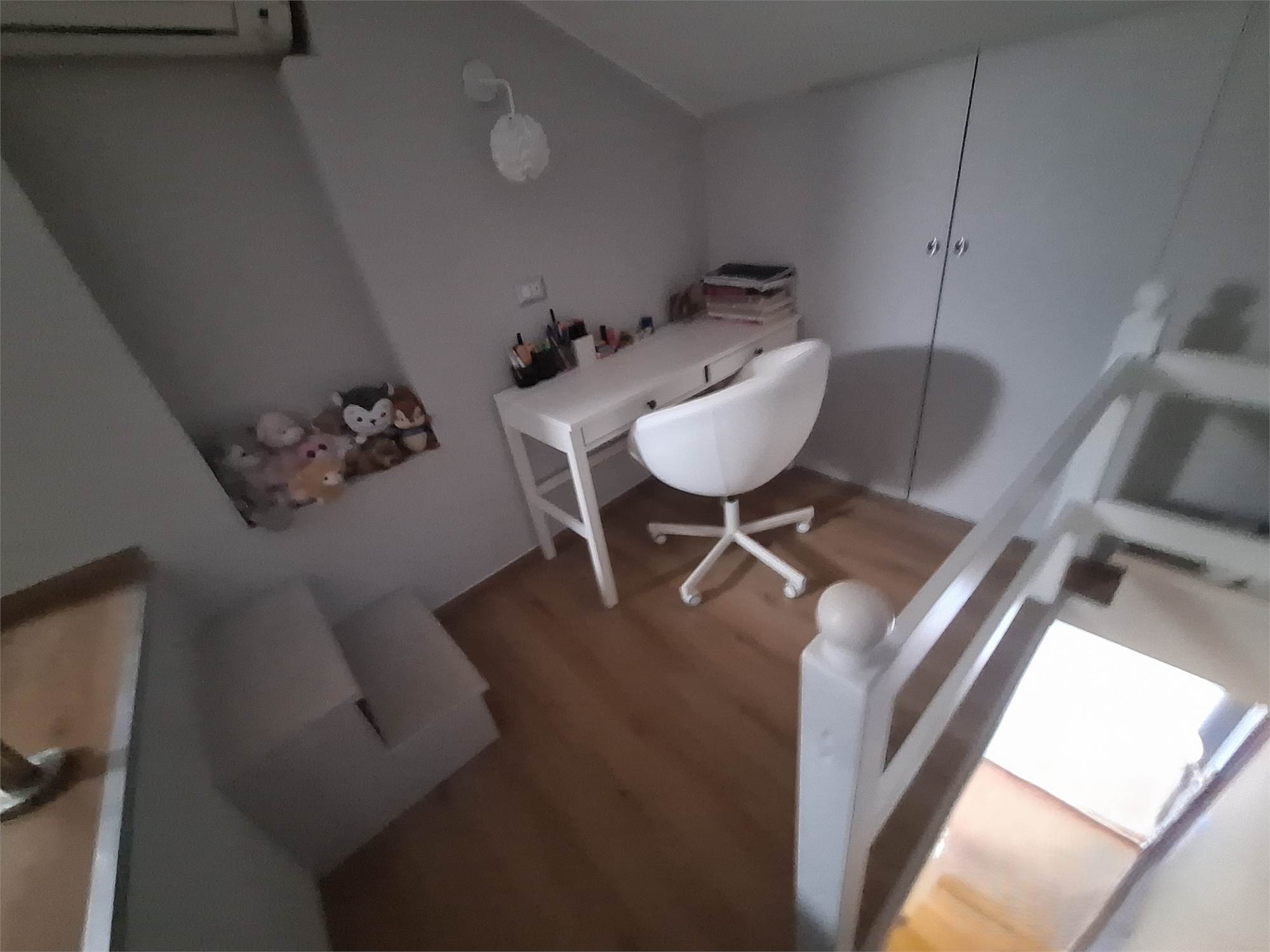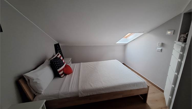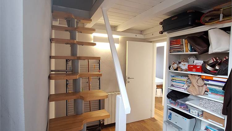 Scala interna che ci porta nella zona notte, disimpegno per due camere doppie, bagno finestrato, una locale studio usato come guardaroba con balcone, e scala nautica da cui si accede a una bella mansardina agibile, non abitabile, ma molto accogliente, attualmente usata come terza camera.