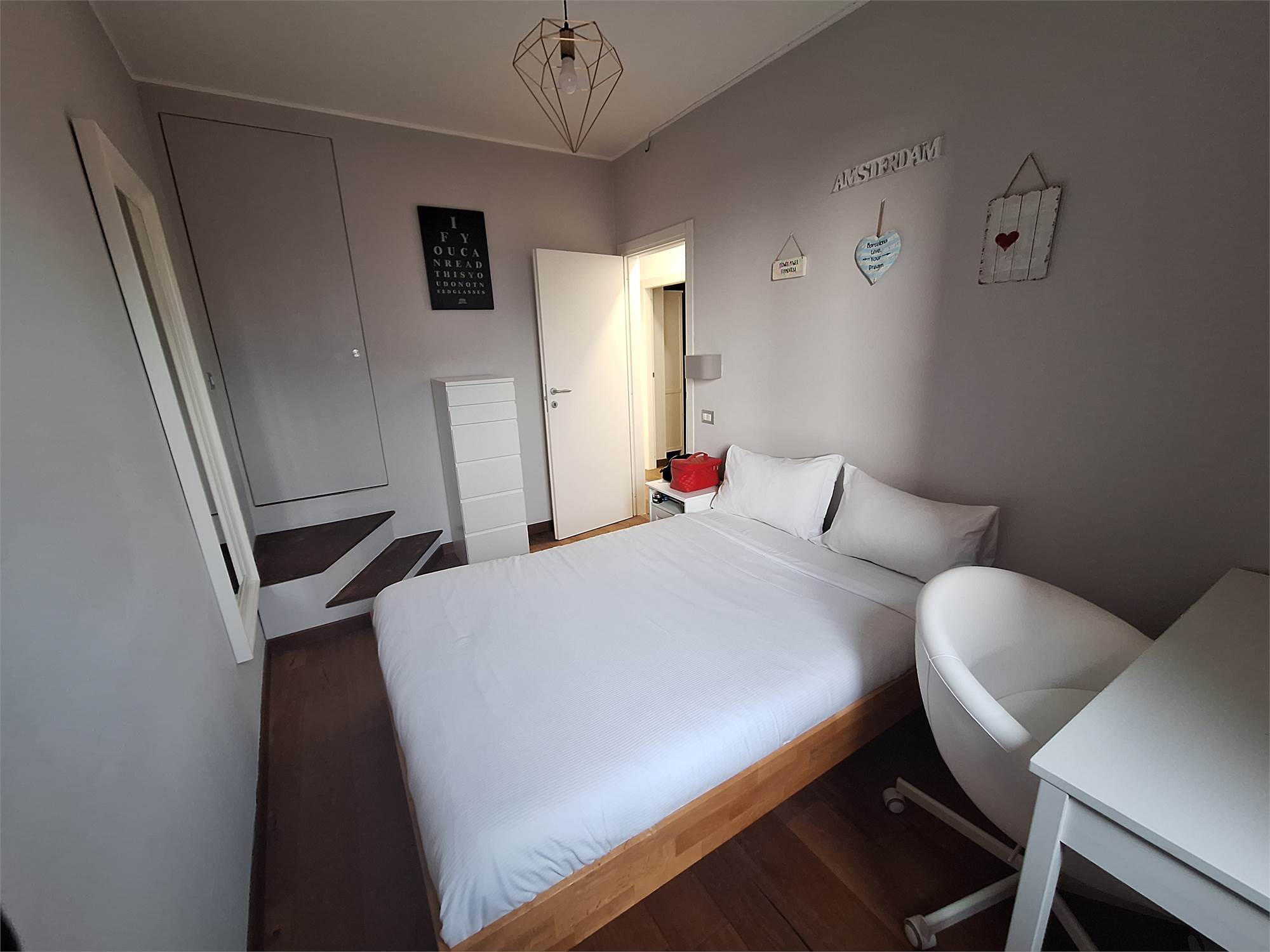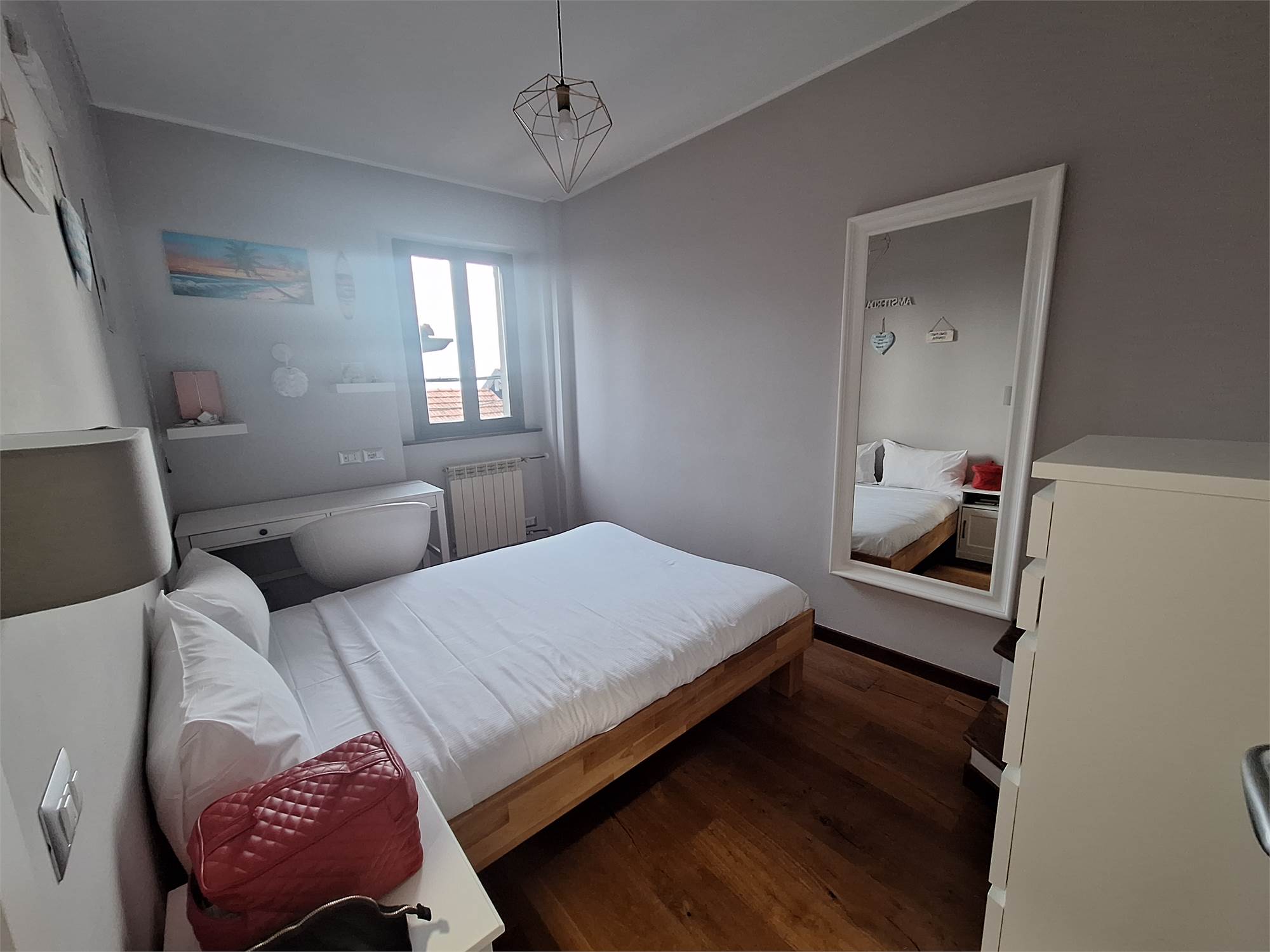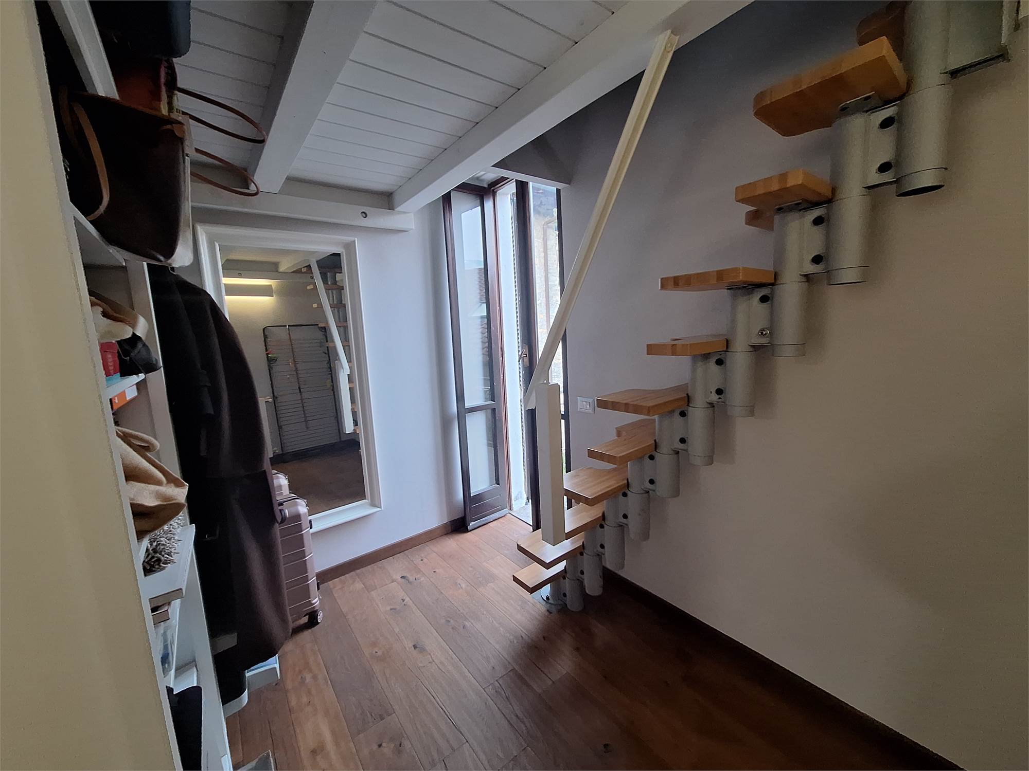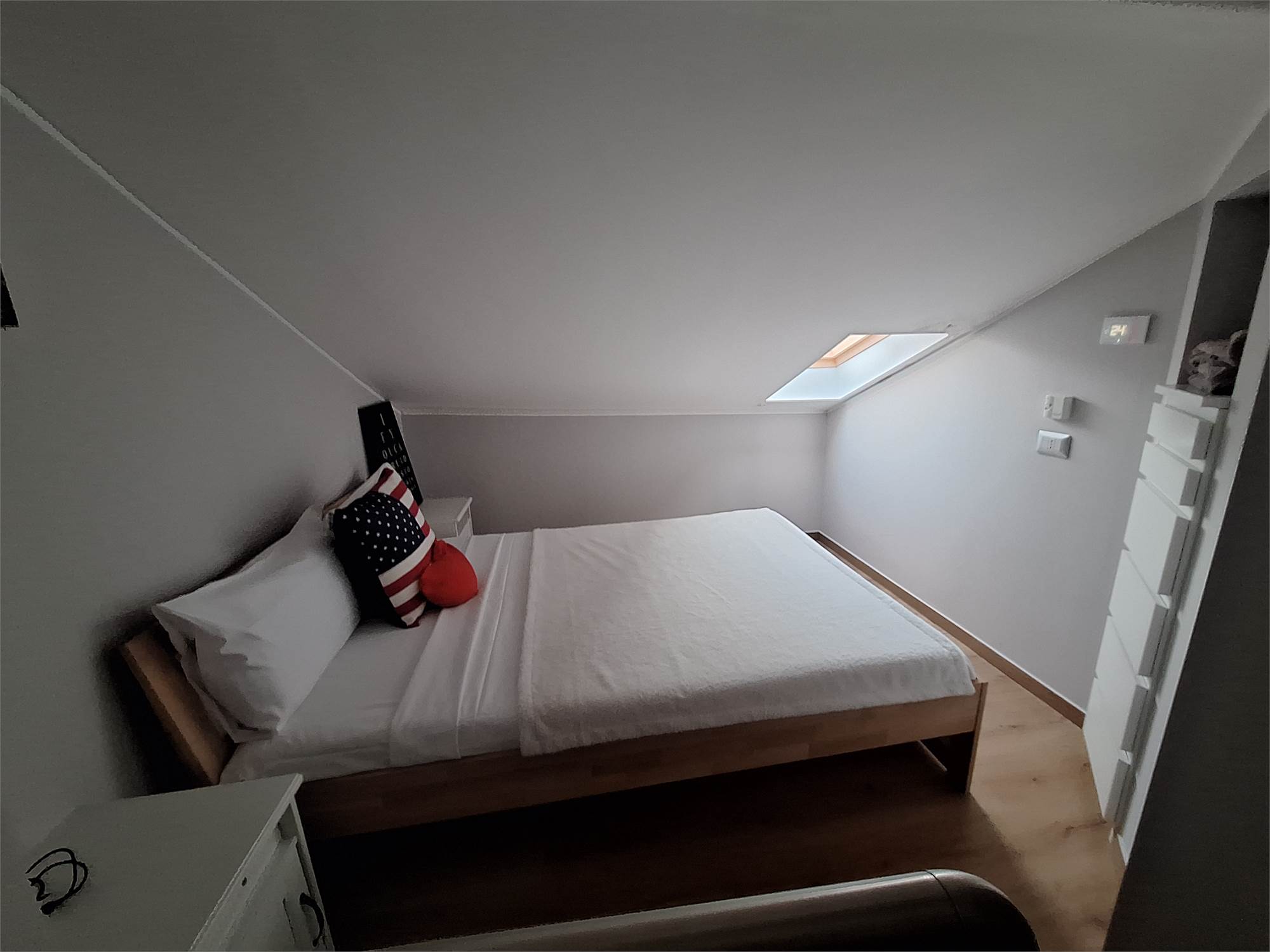 Scala interna che ci porta nella zona notte, disimpegno per due camere doppie, bagno finestrato, una locale studio usato come guardaroba con balcone, e scala nautica da cui si accede a una bella mansardina agibile, non abitabile, ma molto accogliente, attualmente usata come terza camera.