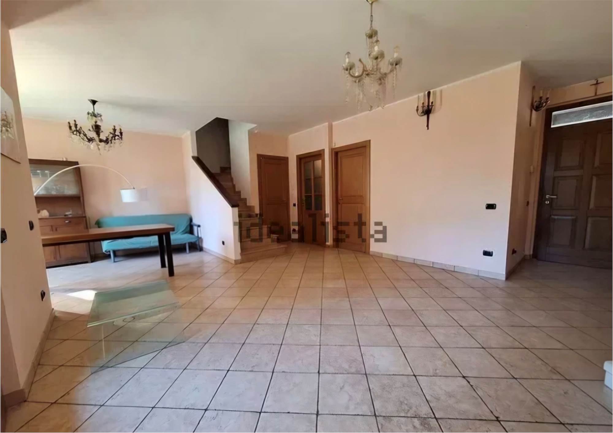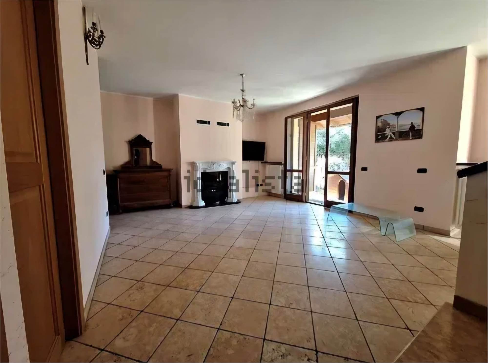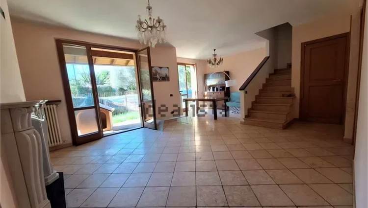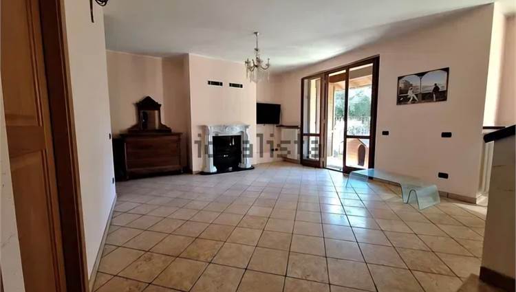 Ingresso principale nel bel soggiorno con due porte finestre che danno a sud sulla veranda e sul giardino. Il giardino non è ampio ed è disposto sui due lati della villetta.