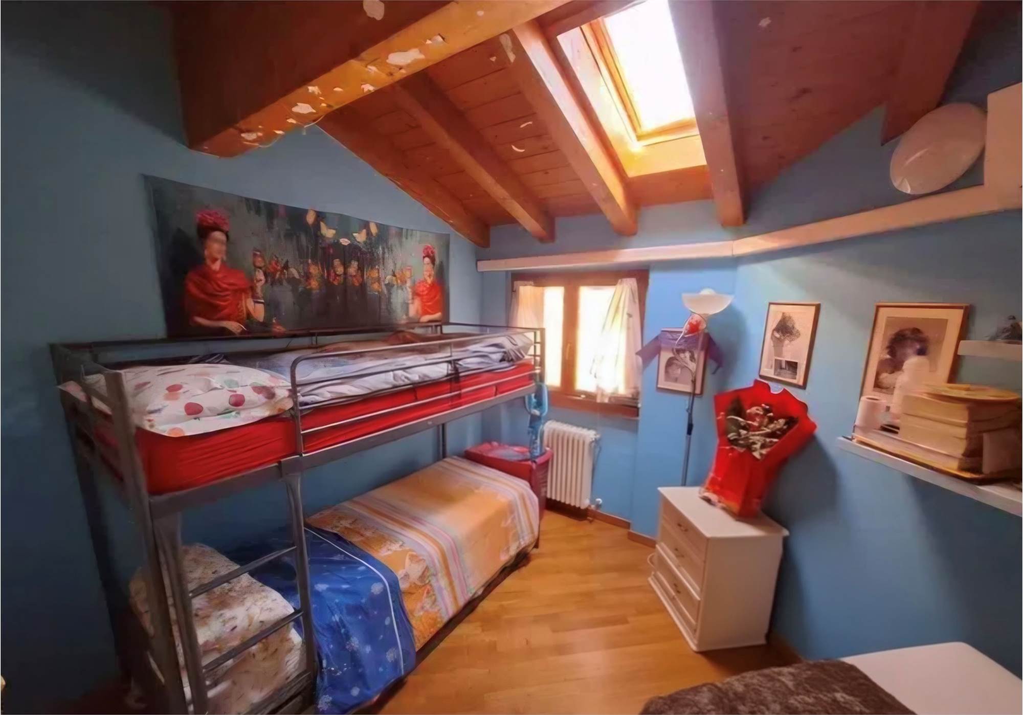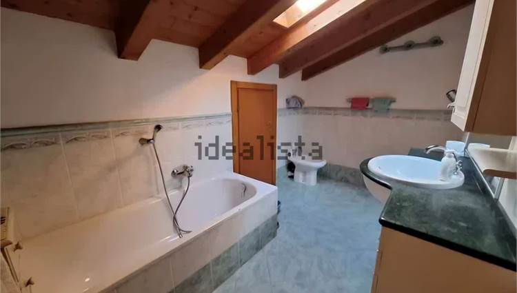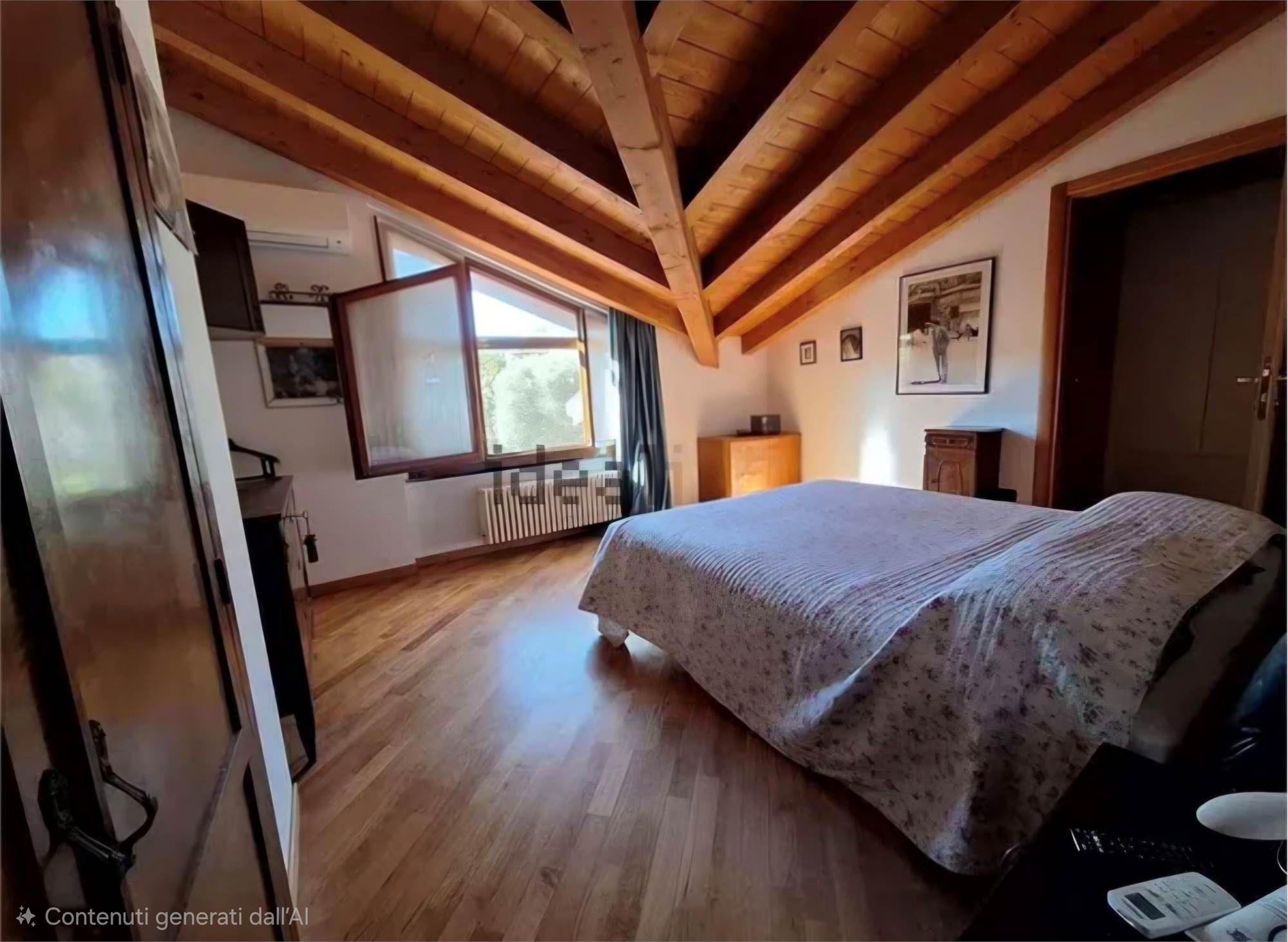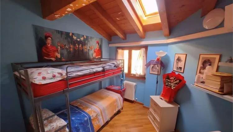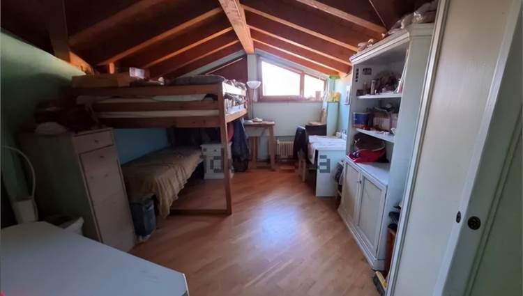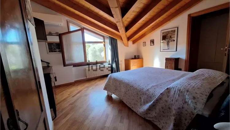 Bella e comoda scala a vista che ci porta al piano notte con la camera matrimoniale, due seconde camere, una spaziosa cabina armadio accessibile a tutte le camere, bagno completo con vasca. Le camere hanno le travature del tetto a vista, tipo mansarda, ma le finestre hanno l'apertura normale non con lucernai sul tetto e sono camere con agibilità abitativa, non ripostigli...